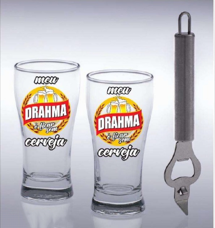 Conjunto contém 1 abridor de garrafa e 2 copos com frase: meu DRAHMA é ficar sem cerveja