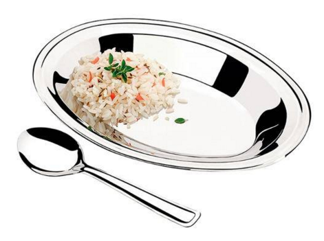 Composto por aço inoxidável, o kit contém duas peças: 1 baixela e 1 colher para arroz.
