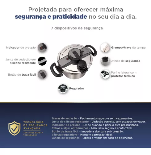 • Com a Panela de Pressão Galaxy Pro, você tem a confiança de um produto de alto desempenho, ideal para chefs e cozinheiros exigentes que buscam eficiência, segurança e praticidade em cada detalhe.